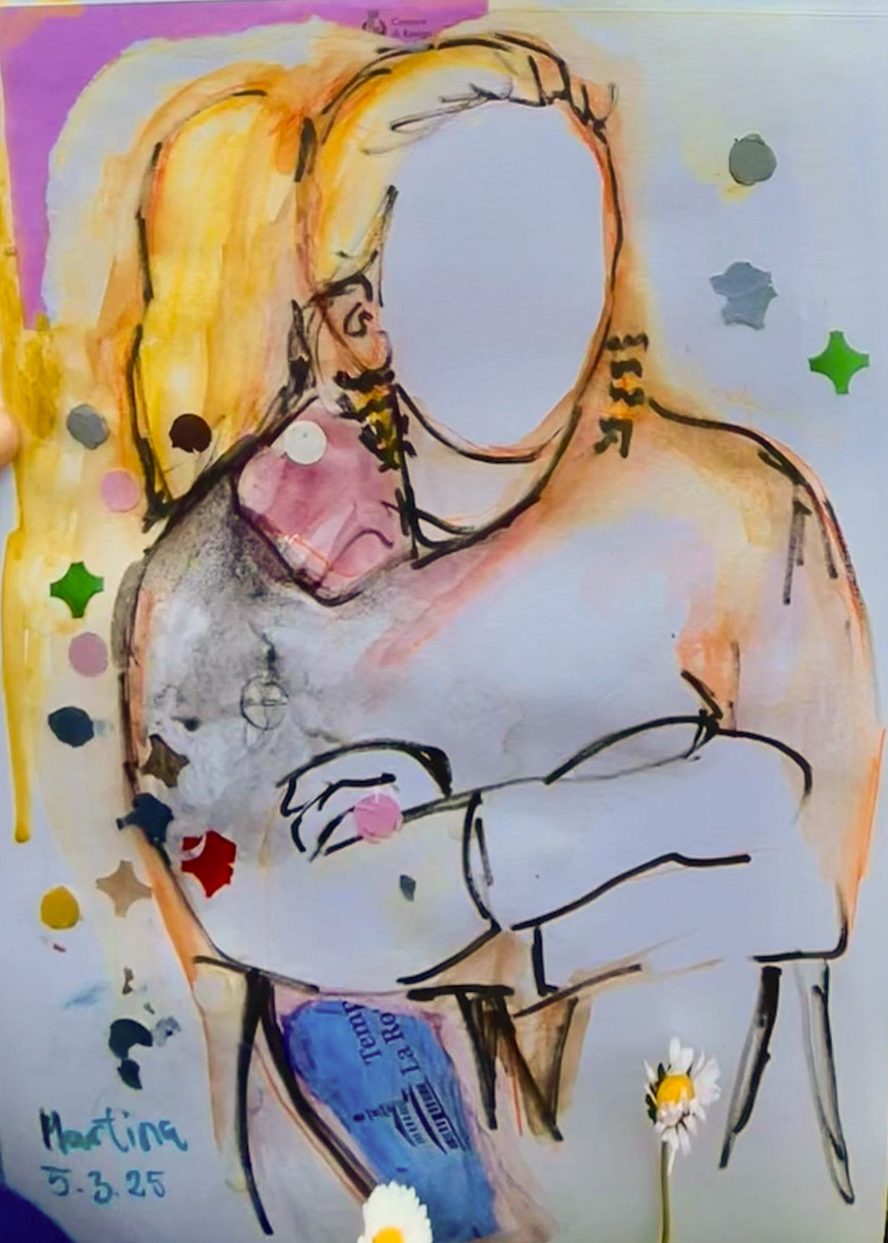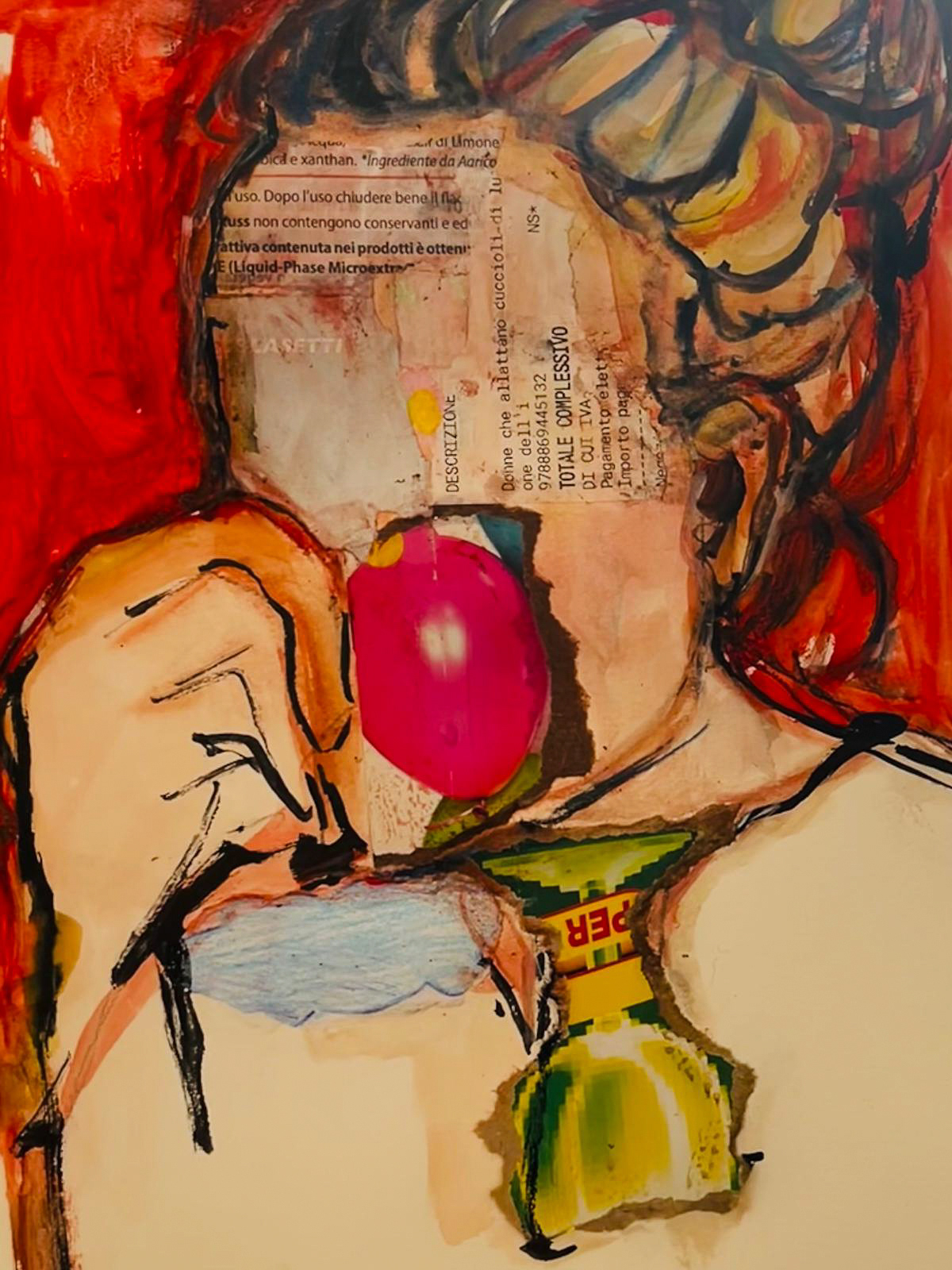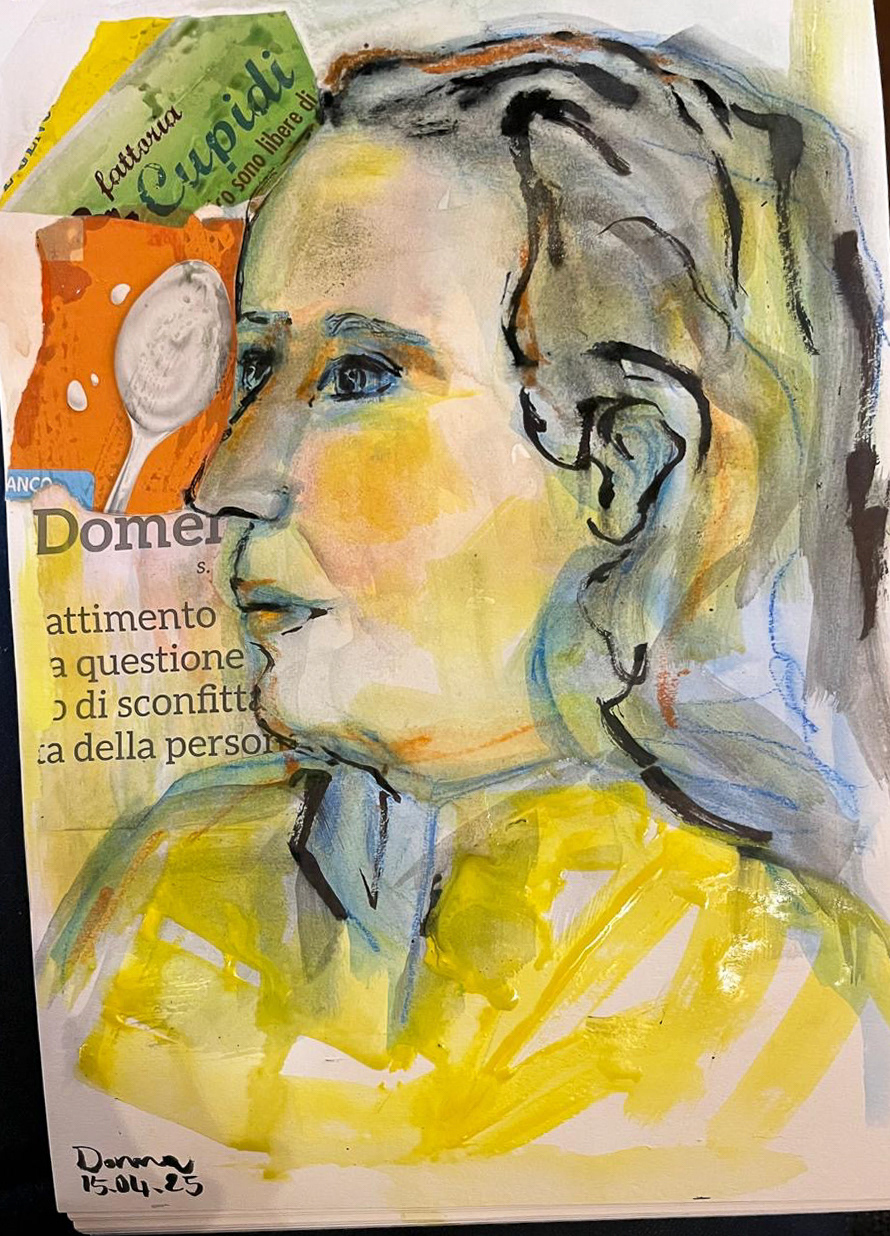 Donna Consalvo lavora con la tecnica del collage e dell’acquerello. La maternità è fatta di strati, frammenti, ricordi, trasformazioni — e il collage permette di restituire tutto questo visivamente. Nei ritratti di madri, Donna inserisce pezzi di carta dati direttamente dalla madre: sono tracce reali della quotidianità, del vissuto. Possono essere appunti, biglietti, oggetti trovati o conservati per anni. Dentro al ritratto c’è una parte materiale di storie individuali, qualcosa di vero e tangibile.